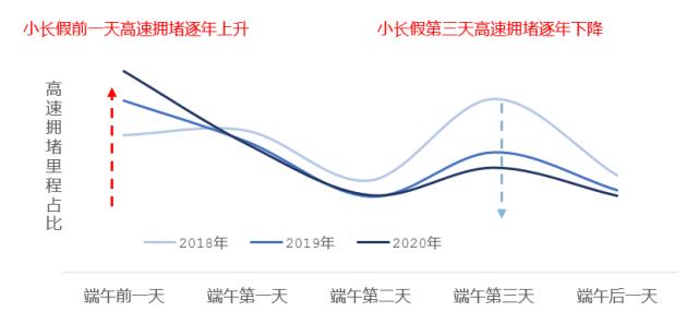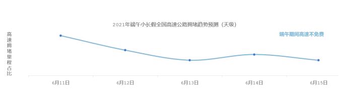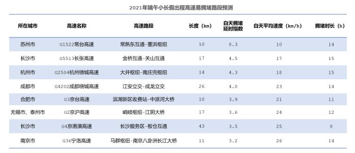 6月3日,高德地图联合全国60多家交通管理部门共同发布《2021端午小长假出行预测报告》(以下简称《报告》),为公众出游和出行提供参考。预计2021年6月11日,即端午假期前一天,为全国高速出程拥堵高峰。 据统计,2018年至2020年,端午假期全国高速拥堵里程呈逐年下降的趋势,而端午假期前一天的全国高速拥堵里程占比却逐年上升。可见,小长假公众错峰出行习惯已初步养成。 预计端午假期前一日为高速出程拥堵高峰 今年端午节假期为6月12日(周六)至14日(周一)放假3天,全国高速路网将不实行小客车免费通行。根据《报告》预测,受周五晚高峰叠加影响,6月11日,即端午假期前一日,全国高速或将迎来出程拥堵高峰。 从具体时段看,预计从6月11日下午14时开始,全国高速交通压力将逐渐增大,17时至22时拥堵程度较高。6月12日(端午假期第一天)10时至12时为高速出程拥堵高峰, 6月14日(端午假期第三天)15时至18时为高速返程拥堵高峰, 6月15日全国高速将恢复到正常水平。 从易拥堵高速路段分析,出程阶段,预计6月11日全国高速出程较易拥堵的路段主要是G1522常台高速苏州段,白天拥堵延时指数为8.3,平均速度约10千米/小时,G5513长张高速及G2504杭州绕城高速紧随其后。 返程中,预计6月14日全国高速返程较易拥堵的路段包括G3京台高速合肥段、 G15沈海高速南通段及S49新扬高速扬州段。端午期间全国高速的交通压力会低于清明、五一假期。
