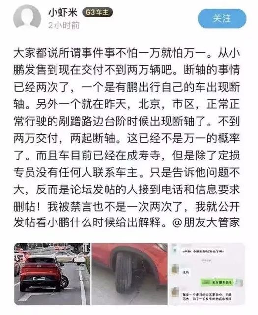| 有车主爆料称自己的小鹏G3在上班途中正常行驶车辆轮毂突然断裂:“车主在上班的途中车子出现异常,之后车一直在抖动,就把速度放慢放到二三十码的速度,突然整个轮毂就断裂了,后来将车拖送到4S店,过了几天后检测报告出来了,4S店称可能轮胎上存在一个受损点,但是也没能检测受损点具体在哪里,最终只给出一个模糊的结果。” 然而4S店给出的回复却是:客户之前在用车过程当中,车子的这个钢圈有一个横向的一个受力、就是外力,然后导致这个钢圈开裂。然后行驶了一段时间之后,由于过劳,造成的客户在最终的事故地点,钢圈是断裂的。但是4S店确没有给出这个受力点到底在哪里? 按道理车子毕竟是一个消耗品,4S店给的解释也在合理中,但是车主说店里也说不清这个受力点在哪里,很多时候我们开车过那种坑没注意到并未减速情况下会出现轮胎鼓包等原因,像小鹏G3轮毂断裂这种情况还是第一次遇见!到底是品控有问题还是如售后所说?我们持续关注!#小鹏G3轮毂断裂# 这次是轮毂断裂,要知道之前小鹏汽车就曾陷“断轴门”事件,19年8月16日,在广州市内,一辆小鹏G3在低速行驶中撞上路边绿化带的水泥护栏,结果前轮车轴断了,从图片中可以看到小鹏G3出行汽车发生单车事故,左前轮严重受损并且脱落,轮毂破损变形。 19年10月9日下午,在北京一辆小鹏G3在行驶过程中急转弯,不慎与左侧路基碰撞,导致车辆右前轮车轴断裂。据事故车主透露,“在右转道正常行驶,前面一辆出租车突然别进来,我为了躲避出租车转了一下方向盘,蹭到马路牙子。稳住方向盘后继续向前走,但感觉异样后下车检查,就发现前右轮横过来了,还有一股焦味儿。” 大潮退去才知道谁在裸泳,新势力造车从神坛多次深陷质量门,时间是验证一切的最好标准,技术之路最公平也最残酷,它注定是一个日积月累的过程,没有捷径可走。 新势力造车还能否经受得住考验?这么多事实案例作为消费者你应该明白哪些可以买哪些不可以买! |