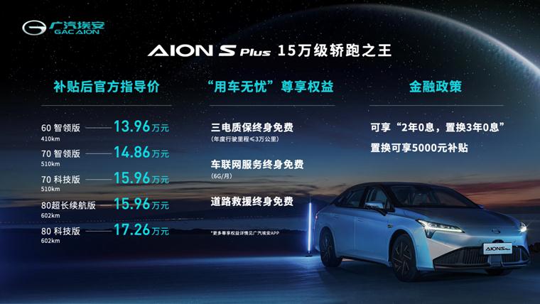 S Plus用户,包括三电质保终身免费、车联网服务终身免费和道路救援终身免费在内的权益包,使AION S Plus的用户起步即领先,惬意畅享绿色出行体验。其中,“用户无忧”尊享权益将为用户提供终身免费的三电质保、车联网服务和道路救援服务,用户还可通过专属APP,一键尊享直连埃安总部、免费安装充电桩和OTA整车智能进化服务,以及首任私人用户专享的代步车服务。通过金融渠道购车的用户,则可享“2年0息,置换3年0息”金融方案,置换用户可获得5000元补贴,坐拥“星空战舰”更轻松。