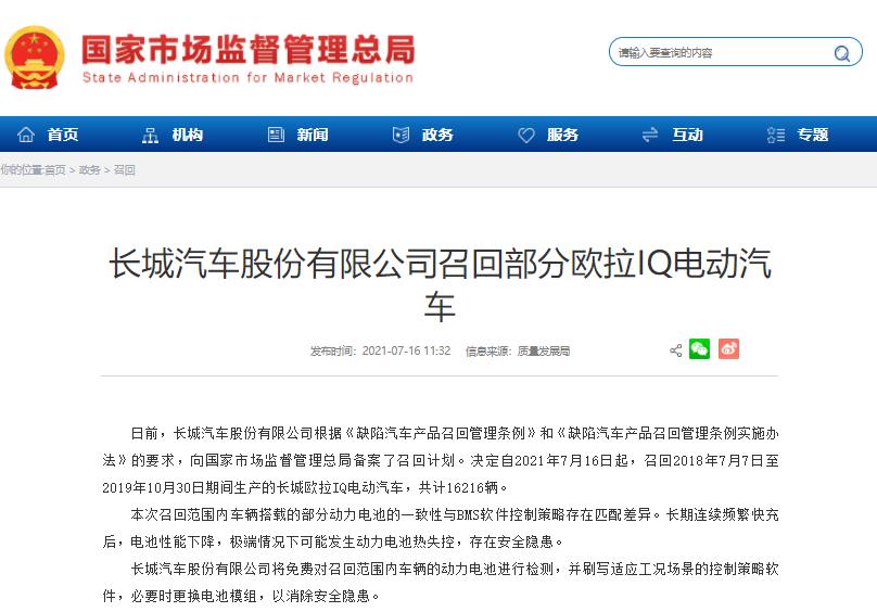 7月16日,国家市场监管局官网显示,长城汽车决定自即日起,召回16216辆2018年7月7日至2019年10月30日期间生产的长城欧拉IQ电动汽车。