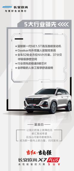 近日,长安欧尚X7PLUS产品配置首次全面曝光,新车全系标配新一代蓝鲸NE系列发动机,并推出1.5T+6MT和1.5T+7DCT两种动力组合共计9款车型,“星灿红、星辰白、星际灰、碧空蓝、丹青蓝、星空蓝”6种车身配色可选。作为长安欧尚首款PLUS旗舰产品,长安欧尚X7PLUS以“五大行业领先、五大同级领先、五大行业首创、五大全系标配”的高价值配置,将树立“15万级SUV价值新标杆“,新车将于8月27日正式预售。 五大行业领先,塑造旗舰新标杆 在用车体验上长安欧尚X7PLUS拥有五大行业领先的高价值配置:蓝鲸新一代NE1.5T 高压直喷发动机、Geeker内外双摄人脸智控系统、全车52处综合NVH方案,37分贝呼吸级静音空间、行业领先的极速8核芯片、会呼吸的人体工程学舒适座椅。 其中,蓝鲸新一代NE1.5T高压直喷发动机为长安欧尚X7PLUS注入的强劲动力,匹配“蓝鲸7速湿式双离合变速箱”组成的黄金动力组合,表现出最大功率138kW,最大扭矩300N·m的动力输出,高效动力让其相较于同级车型有着极为明显的优势,在不久前长安欧尚X7PLUS“性能开箱封测”中,该车表现出了8.23s零百加速、38.57m百零制动距离的最佳成绩,在高速环道测试中还跑出214 km/h的最高时速。