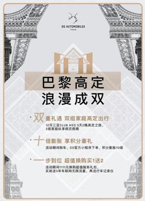 Med享受3天2晚高定之旅,在暖冬中感受浪漫。创立于1950年的法式高端度假村Club Med,遍布全球约30个国家,不仅有饕餮美食供来宾大快朵颐,更有音乐游戏节目,瞬间拉近彼此的距离。 浪漫脱单日 满载“十”分幸福 Dessee女神准备的第二份脱单妙招是【十】倍膨胀,享积分好礼。虽然说礼物只是一种心意,但pick一个暖心的礼物,看到他开心的笑脸,距离表明心意又进了一步。从法国巴黎卢浮宫到中国甘肃敦煌,从萌宠挂件到联名款礼品,DS App线上精品商城内,海量礼物仍你挑选。凡在活动期间购车,DS官方小程序下订即可获得10倍膨胀的积分。 心意再加码 收获“一”步到位 最后一份双十一脱单妙招是【一】步到位,超值换购买1送2。迈出第一步,是为了更进一步。就在双十一这天,约TA一起外出“晒太阳”,增进了解,速度脱单!Dessee女神为你的甜蜜出行提供保障。凡在活动期间购车并加1111元,即可享受超值礼包,包括5年车联网无限流量,一件原厂行车记录仪,还有4年4次机油保养。 不知不觉双十一陪我们走过了13个年头,现在这个日子已经成为了一年当中最重要的购物狂欢,从被人们接纳逐渐变得不可或缺。在这样一个购物的节日里,我们不仅要享受线上购物带来的乐趣,更不要忘了在现实中的生活,找到专属于你的那份浪漫。在这样的狂欢节里,DS不仅加入其中,更玩出新花样,用天生优雅的法式浪漫,结合别具仪式感的节日特惠,为消费者带来更多快乐与惊喜。 |