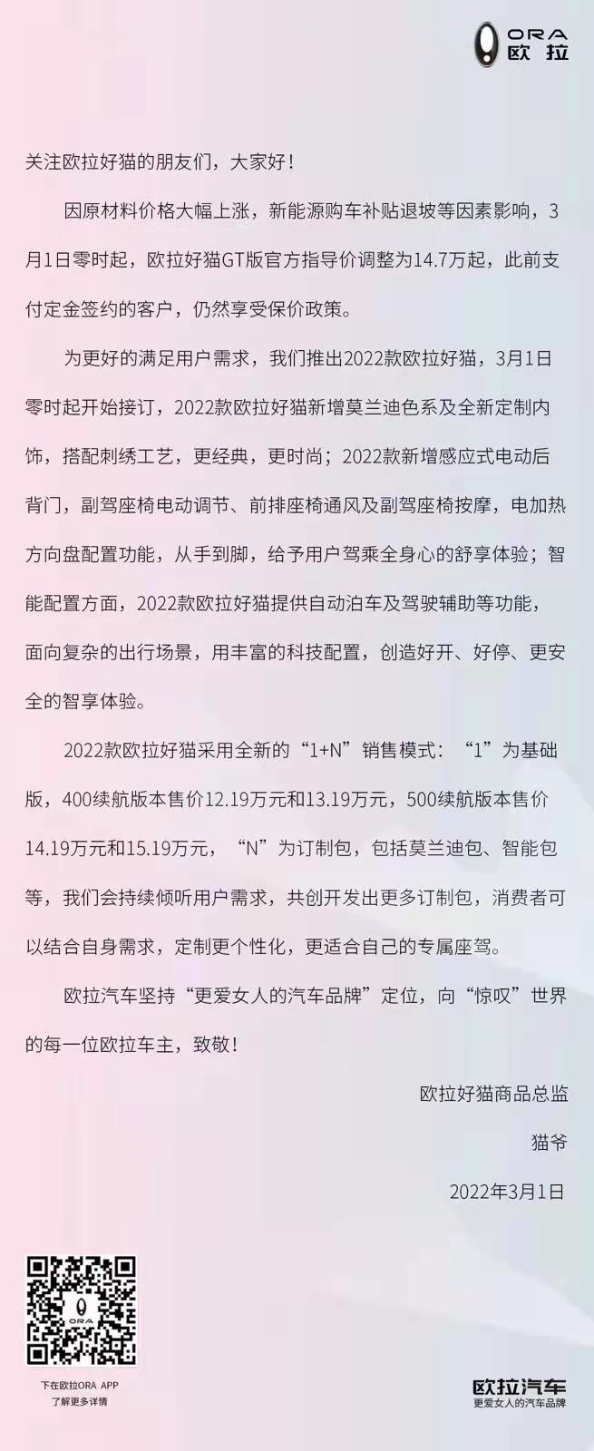 3月1日,欧拉APP发布”3月1日起,2022款欧拉好猫开始接订,好猫GT版价格调整”的消息。据悉,2022款欧拉好猫售价12.19万-15.19万元。采用“1+N”订制模式:其中,“1”代表400km和500km续航的好猫基础版车型,每个续航又根据配置不同分为两种配置版本;“N”为订制包,包括智能驾驶辅助和莫兰迪色选装包。不管购买哪个版本,用户都可根据自身实际用车需求及喜好订制选装包。
