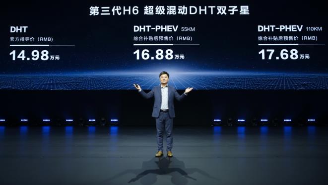 展耀世之姿,第三代H6超级混动DHT双子星耀世登场 品牌战略发布之际,第三代H6超级混动DHT双子星随即正式亮相上市。哈弗H6 DHT HEV 车型上市官方指导价为14.98万元,购车用户可享置换、金融等六重礼包;DHT PHEV车型同步开启预售,55km车型综合补贴后预售价16.88万元,110km车型综合补贴后预售价17.68万元,并同步享受6年12次保养、首任车主三电终身质保等8重礼包。 全球最好的混动技术+全球最专业的 SUV 造车专家,第三代H6超级混动DHT双子星的诞生,只为消除新能源时代用户的里程及安全焦虑而来。 拒绝里程焦虑,哈弗H6 PHEV版本在满油满电的状态下,纯电续航110km版本综合工况续航可达1150公里,即使在匮电状态下,百公里油耗也能低至5.6L,一箱油轻松从北京跑到上海。为了验证产品在极限环境下的续航能力,哈弗委托中汽研在零下40摄氏度到零上60摄氏度的100度极限温差下进行续航挑战试验,在经历连续43小时不间断行驶后,哈弗H6 PHEV完成了高达1178公里的超远续航。 不仅拒绝里程焦虑,更要拒绝安全焦虑。第三代H6超级混动DHT双子星由柠檬混动DHT赋能加持、依托全球标准打造,具备三电系统安全、智能主动安全、碉堡级被动安全的全域三重安全保障,电池经受住了火烧、泡水、挤压三大项超国标严苛考验,为用户彻底解决了新能源汽车行业的安全痛点。新能源汽车最后一块短板,将由哈弗来补齐。传统燃油市场的SUV王者哈弗H6,将在新能源时代再创辉煌。 厚积薄发,再创辉煌。在新能源时代浪潮下,作为中国SUV旗帜的哈弗品牌以勇气和决心毅然华丽转身,全面推进新能源战略转型,重启下一个10年的王者之路。新能源SUV市场的格局,将继续由哈弗引领,SUV领导者,也必将再次领跑新能源时代,以强大实力演绎王者归来! |