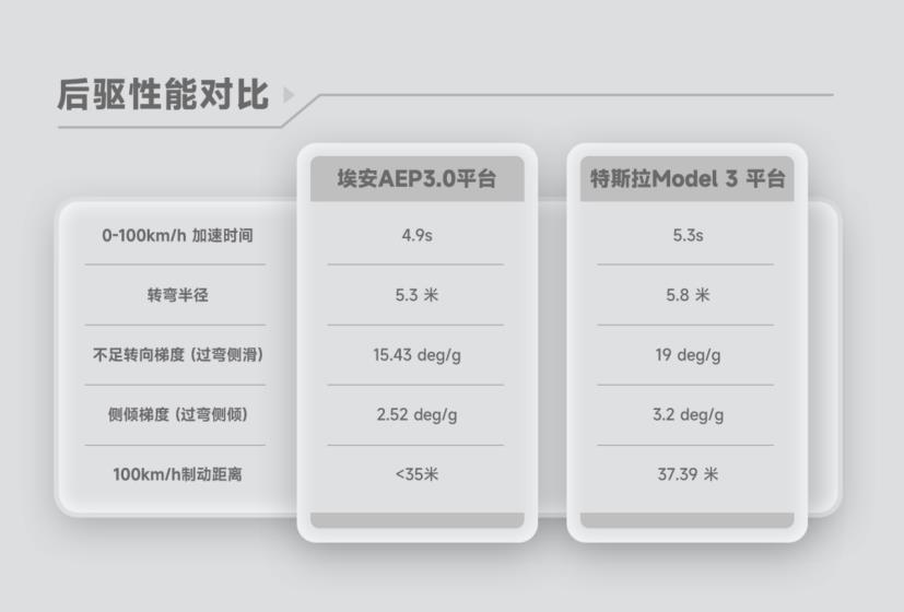 数据是最直观的,从图片上与特斯拉Model 3平台的对比可以看出,同样是3米级轴距和后驱布局的情况下,已经升级到第三代的埃安AEP 3.0平台在转弯半径、过弯侧滑侧倾、加速、刹车性能等方面均具有超越性优势,让用户尽享赛道级的超感驾驭。