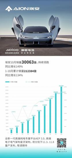 近年来,中国新能源车企气势如虹,以埃安为代表,无论是销量还是技术上,都实现了新的突破。在最新的10月份数据中,埃安10月销量30063台,同比增长149%,1-10月累计销量212384台,同比增长134%,已经提前2个月超额完成全年20万辆目标。