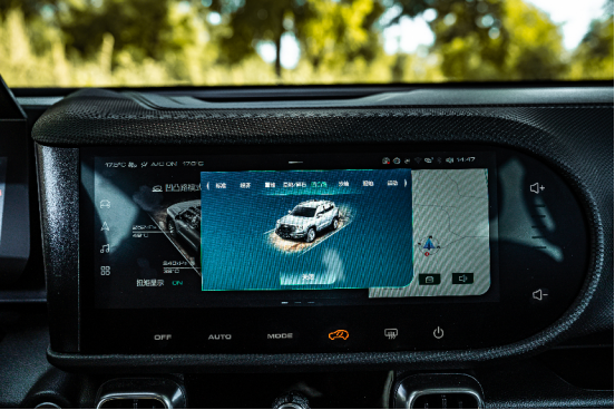 到达露营地之前有一段较长的砂石路,在原车经济、标准、运动、泥地、沙地、雪地在内的6种地形模式基础上,大狗追猎版新增了“草地/碎石+凹凸路”驾驶模式,那必须得用上。同时打开了360°全景影像+透明底盘功能,得以更全面地捕捉到周边及路面安全隐患,并结合行车轨迹动态反映车辆下方的路况,轻松避开一些较大和尖锐的石块,当然大狗追猎版24°的最大接近角、30°最大离去角以及200毫米最大离地间隙也功不可没。