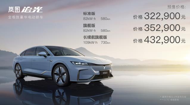 12月15日晚,岚图追光正式首发亮相。岚图追光是岚图汽车首个搭载ESSA+SOA智能电动仿生体的量产车型,领先的技术架构保证其在性能、智能、豪华、安全等各维度的表现都达到同级顶尖水平。岚图追光的首发,也标志着岚图顺利完成了“三年三品类”的战略布局,成为产品布局最完整的中国新能源车企。 岚图追光遵循岚图品牌“天地鲲鹏”的设计哲学,以“光影美学”为设计理念,将传统美学与现代科技完美融合,从超跑驾控、趣享智能、越级豪华、安全标杆等各个维度,重新定义了中大型豪华电动轿车的价值标准,以卓越的产品力,致敬笃定进取、探索创新,为内心热爱全力以赴的追光者。 东风公司党委常委、副总经理,岚图汽车董事长尤峥表示,作为东风公司打造的高端新能源汽车品牌,岚图汽车以科技创新为驱动,通过关键技术打造品牌核心竞争力,坚持人本主义科技创新路线,以“暖心科技”的技术哲学,为用户带去高贵感、尊重感、舒适感、愉悦感和安全感的产品体验。在“暖心科技”理念下打造的岚图追光,将陪伴更多用户超越自我,走向卓越。 岚图汽车CEO卢放说道:“岚图追光是一台拥有全方位极致表现的车,代表着岚图汽车三年来自主研发的最新成果。基于ESSA+SOA智能电动仿生体,岚图追光不仅继承了岚图汽车一直以来在性能和安全领域的优异表现,同时进一步打造了行业顶尖的智能化体验和超越级别的豪华空间。岚图完备的产品阵容将伴随更多的用户心怀梦想,自由追光。” 岚图追光本次发布3个版本。标准版搭载82kW·h电池包,预售价32.29万元 ;旗舰版同样搭载82kW·h电池包,预售价35.29万元;长续航旗舰版搭载109 kW·h 电池包,预售价43.29万元。12月15日起,用户便可通过官方APP和小程序订购。首发用户只需99元即可解锁包括终身整车质保、终身三电质保在内的丰厚权益。岚图老车主增购可享新车首年保险免费;换购可继承权益,也可选择新车首年保险免费。此外,岚图汽车首次推出电池租赁方案,用户可以以更灵活的方式,拥有岚图追光,享受豪华驾乘。选择82kW·h电池包版本的用户购车可减13万元,每月仅需1680元电池租用服务费;选择109kW·h电池包版本的用户购车可减18万元,每月仅需2250元电池租用服务费。 光影美学,彰显流光溢彩的豪华 岚图追光以“光影美学”为设计理念,光与车身、内饰中各线条的组合和变化,使整台车运动不失优雅、激情不失分寸。岚图追光外观由“运动之线”“优雅之线”“速度之线”组成的“光之流线”勾勒出修长匀称的身型,极具辨识度。 岚图追光内饰以光透过不同物体的形态为意向,用凌厉的线条和波动的曲面,为追光座舱塑造了富有韵律的“光之域”,不论是水晶玻璃材质的换挡旋钮和扶手按键、月影式的丹拿浮岛,还是光棱式的座椅缝线,都彰显出岚图追光与众不同的豪华气质。 超跑驾控,打造豪华电动驾车性能天花板 得益于ESSA原生智能电动架构的原生澎湃动力,性能更加优异的电机、精准支配的电控以及超越同级一代的智慧底盘,带给岚图追光超越超跑的加速感和超越传统豪车的驾驶感。 速度方面,岚图追光拥有超越传统燃油超跑的路面表现。行业领先的8层扁线驱动电机让岚图追光能够爆发出的375 kW最大功率和730N·m的峰值扭矩,其零百加速达到3.8s,可比拟一台V8超跑。岚图追光电池峰值放电功率可到500kW,最高时速可达210km/h,同级领先。 岚图追光精心设计的车型结构,带来了赛道般的驾控乐趣。岚图追光风阻系数达到了超跑级别的0.22,全系标配且同级独有的电动尾翼,提供40kg的下压力,使其在高速行驶中也能快而不飘。岚图追光麋鹿测试成绩达到83km/h,可媲美保时捷911。 操控方面,领先行业一代的4D智慧底盘,使岚图追光的操控性达到同级最优。通过行驶过程中对驾驶情况以及前方路面信息的搜集,带给岚图追光在不同路面上如履平地驾控体验。搭载的One Box线控制动系统使其拥有绝佳的刹车性能,百公里时速到零刹停距离达33.8m,连续加、减速10次,动力及制动性能无衰减。 续航方面,岚图追光109kW·h电池包提供730km(CLTC)续航,是目前四驱纯电轿车的最长续航;82kW·h电池包提供580km(CLTC)续航,同样满足用户的日常需求。此外,岚图追光充电10分钟就可以拥有230km续航里程,峰值充电功率可到230kW,同级领先,用户仅需买一杯咖啡的时间,就可以继续安心出发。 趣享智能,开启智能汽车时代下半场 得益于岚图中央集中式SOA电子电气架构的强大功能,岚图追光能够做到真正从用户出发。在驾驶性能上,岚图追光有着更为人性化的表现;在车机体验上,岚图追光也有着越级的智能表现,带来千人千面的用车体验。 岚图追光搭载自研的高速自主领航驾驶系统,可达到L2.9级自动驾驶水平,支持30+项智能辅助驾驶功能,可以实现高速公路、城市快速路场景点到点的智能辅助驾驶。同级独有、全系标配的AR-HUD可提供30+类交通信息,大幅提升驾驶便利性和安全性。 基于岚图中央集中式SOA电子电气架构的车云协同计算,使岚图追光拥有全球首创的远程挪车功能,支持直线30m的自选车位泊入任务,即便人在遥远的异国他乡,也可以通过手机精确操控千里之外的车辆。岚图追光还拥有同级独有的记忆泊车功能,只需经过1次学习,就能实现长达1KM的自循迹泊入车位、召唤泊出。 在车内交互方面,岚图中央集中式SOA电子电气架构赋予了岚图追光丰富