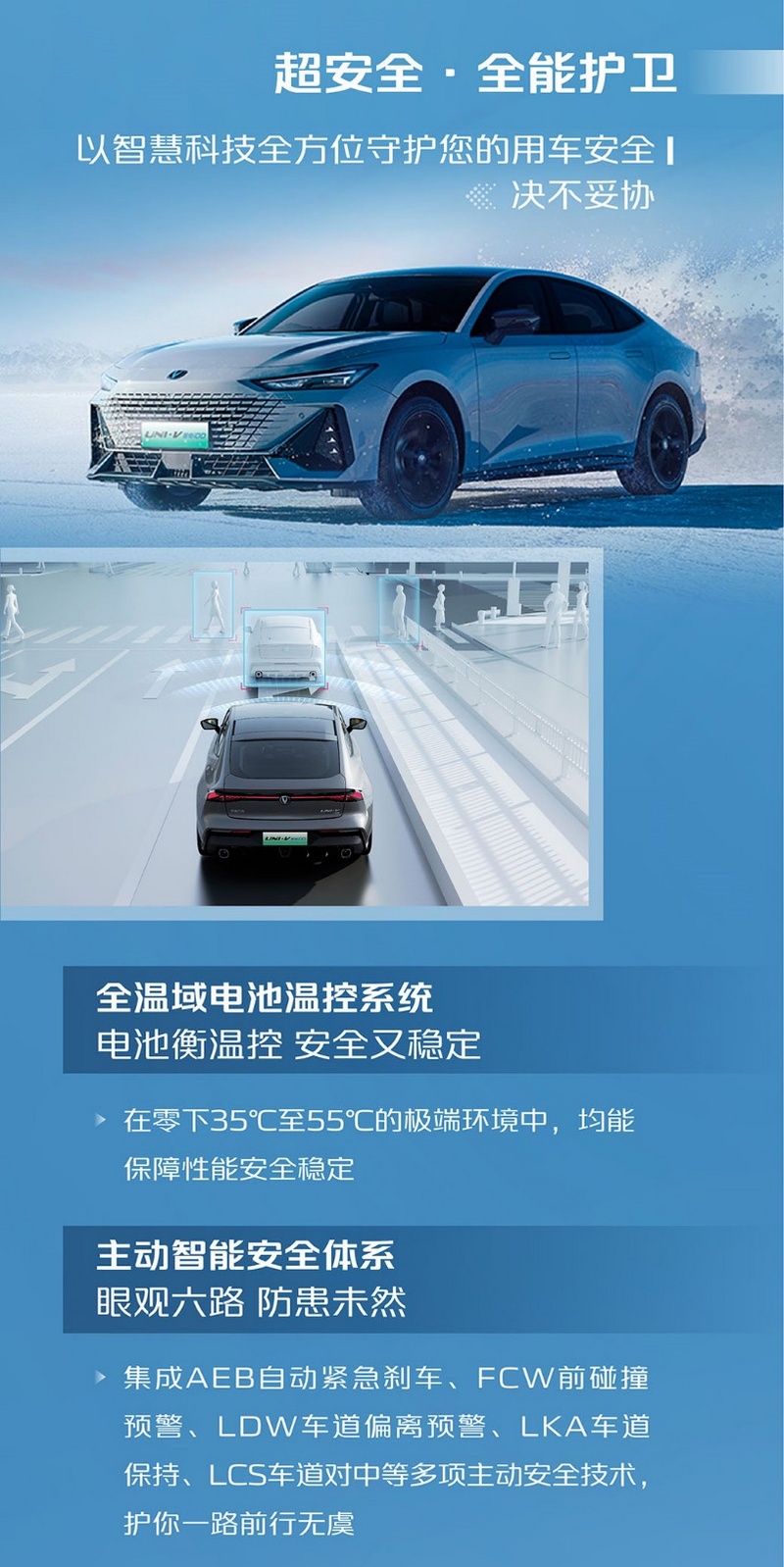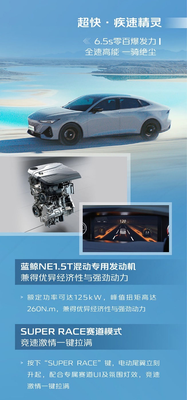 动力方面,UNI-ViDD搭载了蓝鲸iDD混合动力系统,其蓝鲸1.5T混动专用发动机最大功率为125kW,峰值扭矩为260N·m;电机峰值功率为125kW,峰值扭矩为330N·m。得益于蓝鲸iDD混动系统全速域、全场域、全温域和全时域的优异性能,无论是低速起步、高速超车还是赛道竞速,均能保证瞬间的动力爆发。UNI- V iDD的可实现6秒级零百加速,至高车速可突破220km/h,全速高能的动力表现在同级混动车型中非常亮眼。