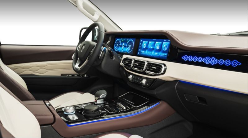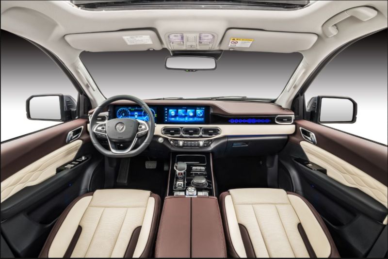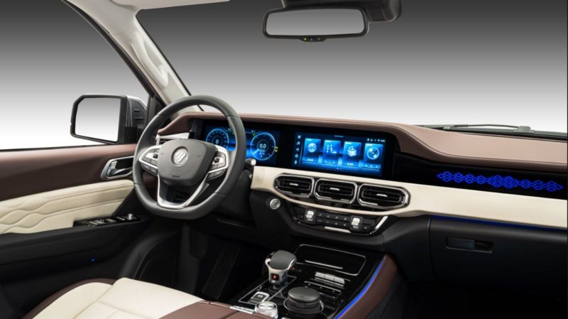 内外兼修 方寸间间感受铁汉柔情 内饰方面2023款大将军皮卡也不输细节。德系豪华大中型SUV风格,横向贯穿环抱式立体座舱设计,获得前所未有的驾驶体验;赛车风格D型方向盘、豪华乘用级运动风格内饰搭配哑光电镀条和高亮黑钢琴烤漆面板,操作手感轻盈顺畅;多功能方向盘后方采用7英寸彩色液晶仪表盘,与10.25英寸高清悬浮式科技Pad屏形成双连屏设计;车内配饰给人高质感、强科技的视觉冲击力。