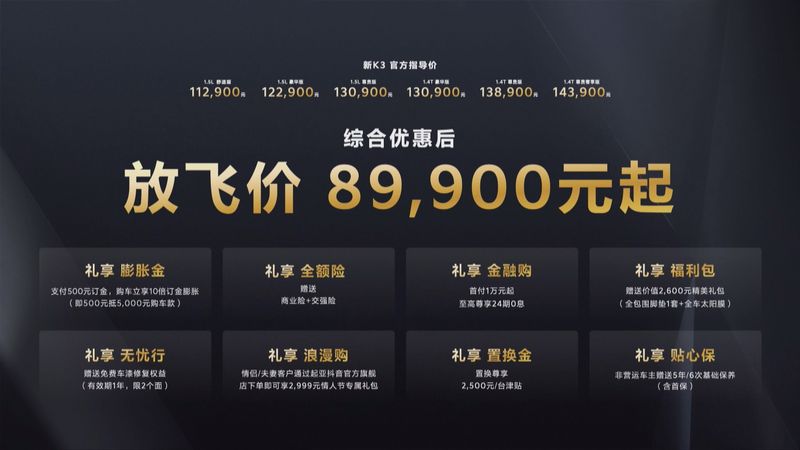 起亚精心为中国消费者带来了礼享·膨胀金、礼享·全额险、礼享·金融购、礼享·福利包、礼享·无忧行、礼享·浪漫购、礼享·置换金和礼享·贴心保八重礼遇。新车共推出6款车型,官方指导价为11.29万元-14.39万元,综合优惠后“放飞价”仅8.99万元起。新K3定位驾趣新生代家轿,产品实力全面进阶,旨在为年轻家庭带来高品质出行体验。