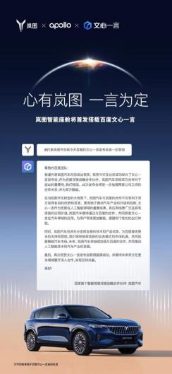 作为首批接入文心一言的车企,岚图将优先获得领先AI技术的赋能,将对话式语言模型技术在国内汽车智能座舱场景中落地。未来,岚图将继续与百度秉持开放合作的态度,形成优势互补,共享资源、共同投入,以更开放的平台实现用户直联、模式创新,打造具备行业竞争力的智能电动汽车产品,为用户带来 更加安全、便捷、智能的出行体验。