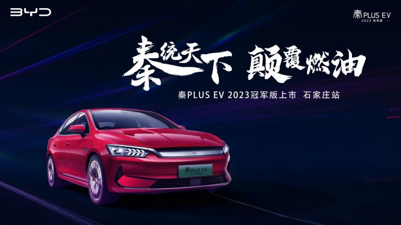五大升级 价值引领 秦PLUS EV 2023冠军版硬核升级、焕新而来,升级了e平台3.0核心技术,车型"含金量"得到了质的飞跃;搭载DiLink4.0智能网联系统,让智能座舱更聪明、更懂你;外观内饰的焕新,让龙颜轿跑颜值更赞! 技术升级:e平台3.0核心技术,创新开发了动力总成多模式热量补偿技术,有效提高了电能到热能的转换率,低温下空调能耗节省40%,大幅度提升低温续航里程,让冬季的续航更实在 动力加强:50KW的强劲动力,0-50km/h加速仅为3.8秒,让每一次的起步都快人一步;动力提升的同时,能耗却在下降,真正做到了省电不省性能,百公里电耗仅为12.5KWh。 智联进阶:升级DiLink 4.0智能网联系统,系统更智能,响应更迅速,百万应用随心下载,模拟手机生态,上手无任何难度;8.8英寸全液晶仪表科技感十足,显示效果细腻,各项行驶所需数据读取清晰准确。 舒享升级:全系新增舒压云朵座垫,皮质面料采用了打孔方案,增强了座椅内部与外界气流的互通,保证乘坐舒适性与包裹性的同时,大幅提升了散热性。 颜值焕新:新增墨玉蓝外观和暖阳棕内饰配色,质感拉满,凸显家轿属性。 通过五大升级,秦PLUS EV 2023冠军版必将成为新一代家轿冠军! 国潮崛起 强势突围 秦PLUS EV 2023冠军版全面进阶的产品力,不仅带来高级的驾乘体验,更能提供当下年轻人,最珍视、最渴望的情绪价值。开秦PLUS EV是一种态度、也是一种生活方式:相信秦PLUS EV2023冠军版会很快成为新一代家轿的冠军,成为是石家庄购车用户的首选! 坚持以用户需求为导向,不断开拓创新产品技术理念引领,颠覆燃油!在新能源逐步取代燃油车的历史节点上,秦PLUS EV 2023冠军版正发起总攻,助力中国品牌在不断夺回属于我们自己的话语权,将颠覆燃油进行彻底!