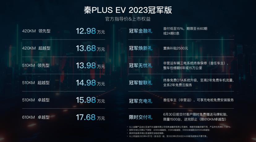 2023年3月份,比亚迪销售207080辆,同比增长97.4%。其中乘用车销售206089辆(含出口13312辆),同比增长97.5%。这个销量碾压合资车,这还不够这个销量还超越了南北大众之合。可以说比亚迪又创造了历史。冠军上新,价值引领。4月21日,比亚迪秦PLUS EV 2023冠军版正式亮相石家庄。比亚迪厂家领导,石家庄主流媒体以及迪粉朋友们欢聚一堂,共同见证纯电轿车领跑者秦PLUS EV 2023冠军版携“技术升级、动力加强、智联进阶、颜值焕新、舒享升级”五大升级,锚定纯电A轿市场新价值,重塑家轿冠军新标杆! 硬核升级 荣耀而来 活动伊始,比亚迪汽车王朝网石家庄大区——大区经理唐瑭先生发表致辞,带领大家回顾了比亚迪秦PLUS车系近几个月取得的傲人成绩,分享了秦PLUS EV 2023冠军版承载的美好希望。他表示:“透过秦PLUS EV 2023冠军版,我们希望为中国A轿市场,再树一个标杆,让高品质纯电A轿,进入主流价格腹地,锚定纯电A轿新价值!让那些想一步到位、跑步进入新能源时代的年轻朋友,能够更轻松的畅享纯电生活。” 随后,比亚迪汽车王朝网内训师李亚坡先生,从五大升级,对2023冠军版做了细致分享并进行了价格公布。其升级的e平台3.0核心技术、焕新的墨玉蓝外观、8.8英寸悬浮式仪表等配置升级,再次惊艳四座,颠覆广大用户认知。 当次秦PLUS EV 2023冠军版的上市价格及优惠政策,共计六款车型: 420KM领先型 官方指导价12.98万元; 420KM超越型 官方指导价13.68万元; 510KM领先型 官方指导价13.98万元; 510KM超越型 官方指导价14.98万元; 510KM卓越型 官方指导价15.98万元; 610KM卓越型 官方指导价17.68万元; 活动中,比亚迪汽车邀请资深媒体人河北新闻网交通部主任王嵩先生,从驾乘感受、市场反馈、消费者口碑等方面,与现场嘉宾分享了他们眼中秦PLUS EV 2023冠军版的颠覆之处。 最后,发布会还邀请到石家庄秦系冠军版首批车主代表来到现场,在众多嘉宾的见证下,比亚迪为他们奉上精美的鲜花和新车钥匙,诚意十足。