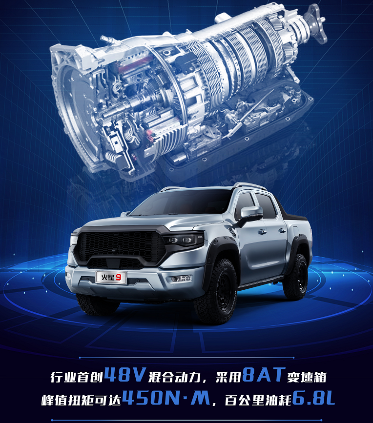 48V柴油混合动力+采埃孚8AT铸就黄金动力链加持 柴油发动机素来以大扭矩,皮实经济耐用为最大卖点,面对复杂的爬坡,负载等路况都可轻松驾驭。但同时也有同时噪音大,污染严重等不足之处等问题也成为其长久以来难以克服的重大缺陷。动力方面,火星皮卡首次采用2.0T涡轮增压传承百年康明斯动力基因的柴油发动机+48V混动轻混系统,不仅实现峰值扭矩450牛米最大功效输出扭矩,油耗更是降低10%以上,同时形成势不可挡的澎湃动力,更在节能驾驶的同时降低车辆行驶噪音,整车降噪15%,让出行更加静谧舒适。; 除此以外,火星皮卡匹配的百年采用采埃孚8AT自动变速箱,其融合智能化技术,可根据拥堵情况和路面状况提前调整优化档位,齿比绵密可实现0.2s即刻换挡,顺畅丝滑无顿挫感带来畅快淋漓的驾乘体验;同时,它还另外采埃孚8AT变速箱更具备停车摘挡功能与空挡滑行模式,搭配HIS(蓄能器)轻松实现整车启停,百公里油耗低至6.8L高效节油一马当先;无论是崎岖山路还是拥堵市区,火星皮卡都能为您带来极致智能、高效节油的驾乘体验。