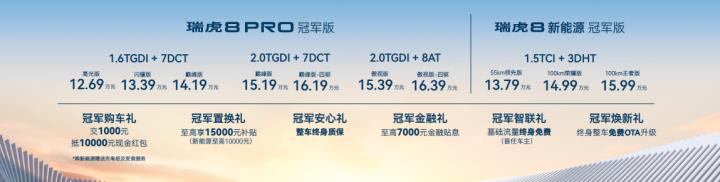 奇瑞的瑞虎冠军系列在全球销量超过80万辆,展现了奇瑞在燃油车市场上的努力。然而,许多人可能未意识到奇瑞也在新能源领域取得了显著进展。奇瑞在新能源汽车方面在技术、科技和空间等方面都表现出色,动力系统更是其强项。不是谁家拿出一款车说是冠军版就能力压群雄,奇瑞就在今天推出了两款冠军版车型,一个燃油版另一个混动版本,说实话发布会现场看过以后你会发现奇瑞无论在燃油车方面的发力还是混动新能源方面的进阶都是一种颠覆。 在北京奥运会成功举办15周年之际,瑞虎8冠军家族在北京·国家奥林匹克体育中心正式上市。瑞虎8 PRO冠军版和瑞虎8新能源冠军版是两款新车型,同时提供燃油和混动版本。瑞虎8 PRO冠军版共有7款车型,价格范围在12.69万元至16.39万元之间;瑞虎8新能源冠军版则有3款车型,价格介于13.79万元至15.99万元之间。除了产品实力的全面进阶,瑞虎8冠军家族还为用户提供了“超级购车礼”,使购车、用车和养车过程更加便捷和省心。这将带给用户全新的超省体验。