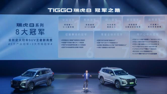 瑞虎8做自己的冠军 更要成为用户心中的冠军 冠军实力不仅表现在全球市场和运动赛场上,更体现在陪伴着80万用户的生活中。瑞虎8助力用户不断突破和超越,创造平凡而又不凡的"冠军人生"。在新车发布会上,71岁车神奶奶徐茂彩、环塔国际拉力赛瑞虎8车队队长陶鹏飞、吉林省红箭救援队成员兼红十字救护员武海波以及车主赵越等四位嘉宾分享了他们对瑞虎8的冠军品质和实力的认可。 瑞虎8家族的鲲鹏动力、超大空间、智能配置等等给他们留下了深刻印象,使他们对瑞虎8产生了信任和选择。这些证言进一步证明了瑞虎8在用户心中的价值和地位,展现了它作为冠军车型的优秀特质。 71岁车神奶奶徐茂彩,吉林省红箭救援队成员武海波,和父亲一样选择瑞虎8的赵越 环塔国际拉力赛瑞虎8车队队长陶鹏飞 瑞虎8 PRO冠军版——5+2座科技旗舰SUV 实力越级 大有可为 瑞虎8 PRO冠军版展现了瑞虎8家族的冠军实力。在空间、科技、动力、安全和品质等五个方面进行了全面升级,拥有“五大产品冠军”实力。该车提供了同级独有的5+2座超大灵活空间布局和升级的女皇适能座驾,实现多场景切换无压力。高通骁龙8155芯片和24.6吋寰宇星云沉浸环绕屏等先进科技配置成为标配,配备了升级的540°高清全景影像等功能,进一步提升了科技水平。 操控方面,新车配备了同级最强的鲲鹏动力1.6TGDI/2.0TGDI+全新自适应线性8AT+全场景智控四驱系统,带来卓越的动力表现和全场景出行的掌控能力。总之,瑞虎8 PRO冠军版以"加量不加价"的方式给用户创造了更多的价值满足感。奇瑞汽车通过真实的努力,打造了国人买得起的优秀车型,展现了瑞虎8家族的冠军实力。 奇瑞汽车股份有限公司总经理助理、用户共创与产品开发管理中心执行总监 洪高明