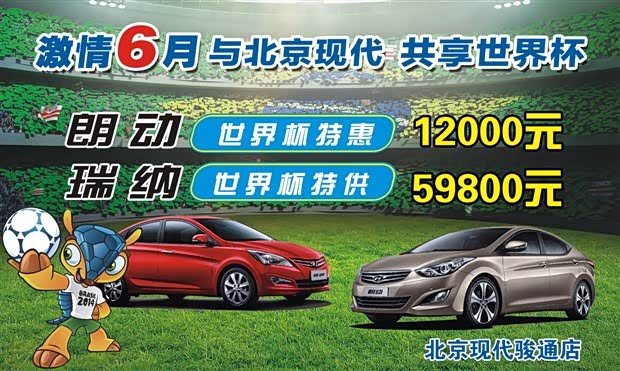 三、新瑞纳世界杯激情版狂野价59800元;朗动世界杯冠军版狂野特惠12000元;世界杯期间直供10台,另送北京现代特别定制限量版足球(国际足联认证);