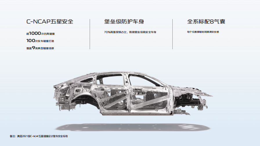 驾车上路,人人都希望安全出行,平安归来。但当碰撞无法避免时,唯有真实力才能护佑生命安全。长安启源A07堡垒级防护车身采用“五横九纵”环抱式车身架构,70%高强度钢占比,铸就壁垒级高安全车身。并且全系标配8安全气囊,每个位置都能给用户满满的安全感,满足2021版C-NCAP五星碰撞设计整车安全标准。