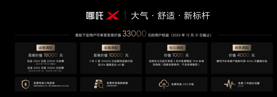 哪吒X提供了四大满配用户权益和两大个性选装包,进一步增强了其标杆实力。首批下定用户可享受高达33000元的满配用户权益,包括优惠抵扣、金融方案以及购车后的贴心服务。其中,11月底前下定仅需支付2000元定金,最高可抵扣20000元;12月份下定则2000元定金可抵扣10000元。此外,还有两年零息十万定额贷款或低首付金融方案,以及购车后两年内免费赠送7千瓦标准充电桩的贴心权益。老客户还可享受4000元购车置换补贴。此外,哪吒X还承诺提供免费终身三电质保、免费终身道路救援、免费终身OTA升级,并提供免费3年每月5G娱乐流量。这些措施旨在为用户提供全面的优惠和服务保障。 哪吒GT运动版车型上市,发布最强官方改装套件 哪吒GT一经上市便连续五个月成为跑车品类销冠,实现了人人都有一个跑车梦的愿景。为了展示年轻人与众不同的野心,哪吒GT发布了两款改装车型:哪吒GT 560运动版和哪吒GT 580 AWD运动版,并提供个性化的官方改装套件单品。