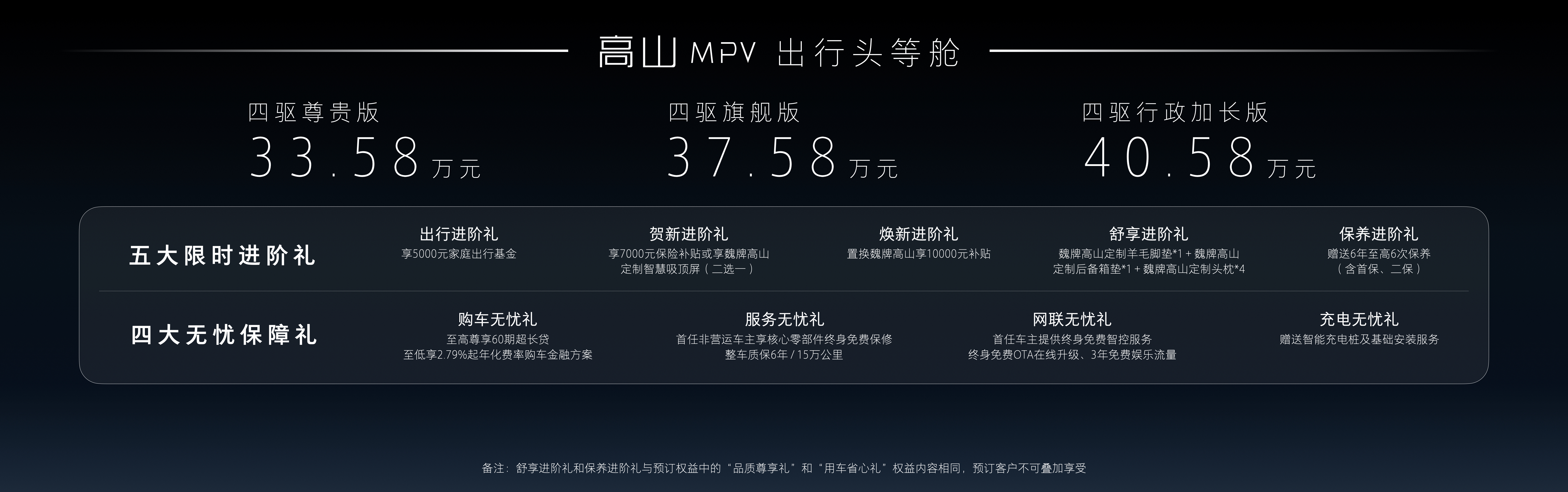 5亿投入,春秋四载磨一剑!魏牌MPV品类的首款产品是魏牌高山MPV,于10月18日推出了三款车型。其中,四驱尊贵版售价为33.58万元,四驱旗舰版售价为37.58万元,四驱行政加长版售价为40.58万元,并且这些车型上市后即可交付。同时,在发布会上,魏牌还提供了五大限时进阶礼和四大无忧保障礼以增加购车的吸引力。