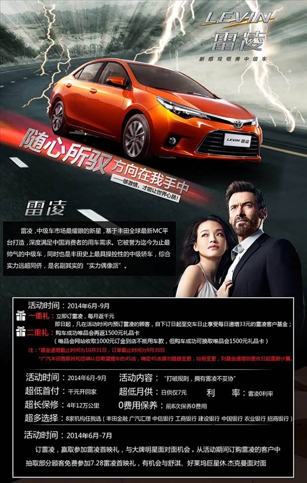 超低首付的雷凌“好易购”、月返千元的雷凌“返利购”,购车成功更送唯品会1500元礼品卡!6-7月预定,还有机会参加雷凌首映礼,与大牌明星面对面!