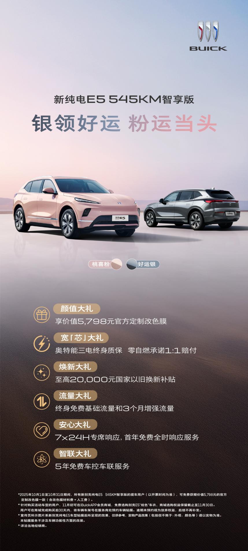 2025年9月30日正值国庆、中秋双节来临,别克品牌推出购车重磅福利:购买别克纯电E5先享版,可在14.99万元一口价基础上,叠加至高“15 倍超级膨胀金”限时福利——1,000元定金抵扣15,000元,实际入手价低至13.59万元,让消费者用紧凑型纯电车的预算就能拥有中大型SUV越级体验;同时选购别克纯电E5智享版,可限时免费获赠售价5,798元的“好运银”或“桃喜粉”限量版炫色车衣,兼顾个性化审美与美好寓意*。此外,所有版本均享受奥特能三电系统终身质保、零自燃承诺1:1赔付、5年免费车控车联服务等安心保障,还可叠加至高2万元置换补贴。别克纯电E5真正从用户核心需求出发,以实打实的权益降低购车与用车成本,为消费者提供高品质纯电出行解决方案。 别克纯电E5推出重磅福利:15倍超级膨胀金+免费限量炫色车衣双重惊喜 炫色车衣时尚“换装” 诠释个性化出行美学 当下,车身色彩已成为用户展现个性审美的重要载体。此次别克纯电E5推出的两款炫色车衣,以时尚视觉语言升级整车气质,为纯电出行提供更多样化的风格选择。其中,“好运银”采用内敛华丽的金属质感银色,在不同光线下熠熠生辉,诠释现代简约美学;更蕴含“稳握幸福、家庭事业‘银’得圆满”的美好寓意,彰显车主不凡品味与从容姿态。“桃喜粉”从天际流霞中汲取灵感,柔和基调中透出鲜活活力,低调而不失吸睛度;其命名同样暗藏巧思,寓意“生活甜蜜常伴、好运频至”,让每一次出行都满含轻快与浪漫。 别克纯电E5推出“好运银”“桃喜粉”两款限量版炫色车衣,诠释个性化出行美学 在满足出行美学需求的同时,别克纯电E5更聚焦家庭出行的核心需求,以宽适空间设计保障每位乘客的乘坐舒适度。别克纯电E5拥有2954mm超长轴距,通过科学布局实现“座座皆舒适”——同级领先的坐高与肩部空间,搭配后排纯平地板,确保前后排乘客腿部空间宽绰;专为纯电平台开发的宽体人机工学座椅,采用宽体悬浮头枕与双硬度发泡工艺,精准贴合人体曲线,既能有效缓解长途驾乘疲劳,又能在过弯时提供坚实侧向支撑,兼顾舒适体验与乘坐安全。 15亿公里零自燃 安全实力铸就行业标杆 别克深谙安全是纯电出行的基石,也是消费者关注的首要问题。截至今年8月,奥特能平台车型已累计安全行驶15亿公里零自燃,持续刷新电动车行业安全纪录。别克纯电E5基于通用汽车奥特能智电平台打造,电池安全开发及试验标准远超行业水平,提前满足“史上最严”2026电池新国标,从根源筑牢安全防线。 别克纯电E5的电池具备高热稳定性、充放电功率大、低衰减、长寿命等技术优势。行业领先的电池管理系统,搭配“车-云”一体全天候电池健康监测功能,能实时智能精准管理电池状态,提前预警潜在风险;超高强度钢井字形结构电池壳体,结合与整车系统联动的安全架构设计,可大幅分散碰撞冲击力,强化电池防护性能,实现从电芯到系统、从硬件到云端的全方位安全守护,真正做到“全路况安心驰骋,全生命周期可靠相伴”。 别克纯电E5依托奥特能智电平台打造,以极致安全性与可靠性为用户纯电出行全程护航 值得一提的是,别克纯电E5的电池支持全生命周期快充,经CLTC工况80万公里循环验证,衰减率仍低于15%,真正实现“经久耐用不虚标”。此外,整车更经历等效超400万公里、覆盖全天候全路况的耐久性测试,以极致安全与可靠性,让用户每一次出行都加倍安心。 全系标配别克eConnect智舱和eCruise辅助驾驶 从容操控更轻松 作为一款“无短板”家用纯电车型,别克纯电E5在智能化配置上,以“全系标配”凸显诚意。智舱层面,全系标配同级唯一30吋一体弧面6K屏,搭载别克eConnect 5.0 车机系统,支持“界面最美”的CarPlay iOS26系统,实现车机与手机无缝互联。车载高德地图与手机端实时同步,自带红灯倒计时功能,出行导航更省心;新增沉浸、雾霾防护、透气等场景模式,一键营造适配需求的车内氛围。全新AI大模型赋能智能交互,可实现深度推理、快速检索及创意绘图;升级的语音引擎支持口语化交流,毫秒级响应速度可连续执行十条指令,还支持多音区识别,真正实现“动口不动手”,驾驶更专注、操作更从容。 别克纯电E5标配eConnect智能座舱+eCruise辅助驾驶,打造智慧便捷的出行体验 辅助驾驶层面,别克纯电E5同样下足功夫。全系标配eCruise L2级辅助驾驶系统,涵盖LCC车道居中辅助、AEB自动紧急制动以及电容感应式方向盘等功能,还搭载 360°透明底盘及尾门安全开启提醒,全方位覆盖行车与泊车场景。此外,传承别克“大师级底盘”技术,五连杆后悬架搭配VMC智能底盘系统,别克纯电E5实现加速不晕、刹车平稳、颠簸不晃,后排乘坐更舒适,无论新手还是首次“油换电”的老司机,都能快速适应、从容驾驭。#别克E5零自燃 #别克E5炫色车衣限时免 迈入纯电出行新时代,别克纯电E5凭借大空间、超安全、长寿命、智能化的综合产品力,切实回应了消费者对当下“第四代电动车”在纯电出行安全与品质上的深切需求。此次限时钜惠政策的推出,为广大消费者带来入手安心、用车省心的绝佳机遇,让高品质纯电生活触手可及。感兴趣的用户可前往别克线下4S店试乘试驾,或通过别克官方APP、微信小程序及官网查询活动详情,锁定限时专属福利。 |
