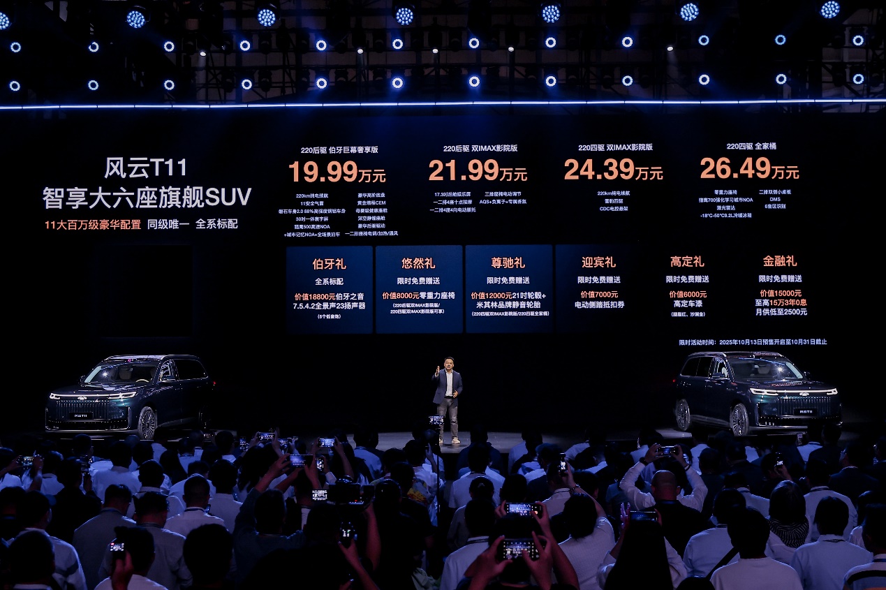 2025 年 10 月 13 日,以 “兑现” 为主题的风云 T11 家庭品鉴日暨预售发布会,在安徽芜湖圆满落幕。风云 T11 作为品牌焕新后首款旗舰 SUV,定位 “智享大六座旗舰 SUV”,秉持 “顶格对标” 理念,依托 “超大更好” 四大核心价值、三大沉浸式场景及 11 大全系标配,革新定义家庭出行豪华体验,精准兑现中国家庭对品质生活的全维期待。 风云T11已正式开启预售,共推出4款版型,其中220后驱伯牙巨幕奢享版预售价19.99万元;220后驱双IMAX影院版预售价21.99万元;220四驱双IMAX影院版预售价24.39万元 ;220四驱全家桶预售价26.49万元。同时,发布会现场公布了以下多重极具诚意的预售权益,为用户带来“一步到位”的豪华拥车体验。 锁单风云T11至高享价值66800元惊喜六重礼: ①伯牙礼: 全系标配价值18800元伯牙之音7.5.4.2全景声23扬声器; ②悠然礼: 限时免费赠送价值8000元零重力座椅(220后驱双IMAX影院版/220四驱双IMAX影院版可享); ③尊驰礼: 限时免费赠送价值12000元21吋轮毂+米其林品牌静音轮胎(220四驱双IMAX影院版/220四驱全家桶可享); ④迎宾礼:限时免费赠送价值7000元电动侧踏抵扣券; ⑤高定礼:限时免费赠送价值6000元高定车漆(胭脂红、沙澜金); ⑥金融礼: 限时免费赠送价值15000元,至高15万3年0息,月供低至2500元。 权益说明:活动时间:2025年10月13日预售开启至2025年10月31日24点截止 ①伯牙礼: 包含7.5.4.2全景声布局,2880W峰值功放; ②悠然礼:二排右侧座椅免费升级零重力座椅,支持14向电动调节,可享版型为220后驱双IMAX影院版/220四驱双IMAX影院版; ③尊驰礼:免费升级21吋轮毂,21吋米其林品牌静音轮胎,可享版型为220四驱双IMAX影院版/220四驱全家桶; ④迎宾礼:活动时间内锁单的客户,赠送价值7000元电动侧踏抵扣券(指导价10000元),需在提车经销商门店进行踏板订购及安装; ⑤高定礼:活动时间内锁单的用户免费选装价值6000元高定车漆(胭脂红、沙澜金); ⑥金融礼:活动时间内享至高15万3年0息金融方案。 *最终解释权归奇瑞汽车所有,详询奇瑞汽车授权经销服务商 超安全,家庭移动的堡垒 对家庭用户而言,安全是风云 T11 最郑重的守护承诺。发布会现场,一场极具视觉冲击力的实车碰撞测试震撼上演 —— 无需多余解读,用真实碰撞直观印证了其 “移动安全堡垒” 的硬核实力。 此外,风云T11还具备AEB紧急制动、电池IP68超国标防护、母婴级健康座舱、8255数据安全岛与20+项主动安全驾驶辅助功能,实现从呼吸健康到驾驶预警、从物理防护到数据加密的全维安全体系。 每一排都是VIP,大空间融合多场景体验 风云 T11 以 5205*1998*1800mm 的旗舰车身尺寸,搭配 3120mm 超长轴距,直接将 “宽适” 具象化 —— 不仅撑开越级空间气场,更让 “每一排都是 VIP” 的体验落到实处。 风云T11除了有空间优势外,更拥有全面的场景智慧。一键语音拓展1.8m大床,结合5G网络与三温区空调,打造“露营全家桶”;而母婴级环保材质、AQS+负离子净化与静谧座舱,则共同构筑出安心健康的“移动智趣成长空间”,轻松满足每一位家庭成员的驾乘需求。 更豪华,视听盛宴媲美百万豪车 风云 T11 将 “更豪华” 的内核,拆解为全家可感知的驾乘细节 —— 通过动力、底盘、静谧性的深度协同,打造出 “全程舒适无短板” 的高端出行体验。 座舱之内,豪华感知触手可及。30吋一体寰宇屏与17.3吋后舱娱乐屏构成前后双IMAX级视听空间,配合伯牙之音23扬豪华音响系统,打造出7.5.4.2全景声环绕的移动音乐厅;而9.2L冷暖小冰箱支持支持-18℃-50℃调节,行车途中冷饮热食随心取用,让每一次家庭出行都成为视听与味觉的双重盛宴。 从外至内,风云T11不放过每一处细节的打磨。极具东方美学的车身搭配8层车漆工艺不仅赋予车身如玉般温润光泽,更提升整车质感与耐久度。这一切配置,皆旨在为用户营造一个集视觉、听觉、触觉与体感于一体的“移动豪华客厅”,让驾驶成为享受,让乘坐成为疗愈,真正兑现旗舰级SUV应有的感官礼遇。 好智慧,全场景AI陪伴,驾驭轻松自如