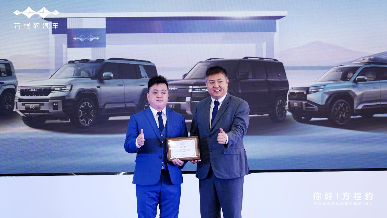 在全场嘉宾的共同见证下,方程豹汽车河北大区经理董志敏先生,向河北璋晨集团腾势方程豹品牌总吴宝贵先生郑重授牌。