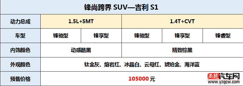 近日,吉利汽车宣布第二款全新跨界SUV-吉利S1正式开启预售,此次预售活动将在天猫吉利汽车官方旗舰店和车商城吉利汽车品牌旗舰店同时上线,共推出1.4T+CVT和1.5L+5MT五款车型,还有两种内饰颜色、六种车身颜色可选,预售价为10.5万元。据悉,吉利S1将在11月17日的广州车展上正式上市。 作为吉利汽车布局跨界SUV市场的第二款战略车型,吉利S1采用全新锋·睿造型设计,将流线型设计和硬边艺术完美融合,整体上柔中带刚、刚中兼柔,展现出时尚感、力量感与运动感,开创了“新硬派”跨界风潮,充分满足当下活力进取的85后年轻人群的多元化需求;吉利S1采用了水滴涟漪回纹前格栅、远近光一体的隼式锐光LED大灯、獠牙式下格栅、战戟式LED尾灯等,尽显其硬朗锋尚的跨界个性,极具张力和力量感。 同时,吉利S1拥有丰富的人性化智能科技,8英寸高清全触控电容大屏集成了全新的G-Netlink3.0智能车载系统,支持智能语音交互、4G高速上网、高德智能导航系统、百万曲库云音乐、Carplay+Carlife智能双机互联等;还有手机APP远程监控功能可远程控制车辆锁车&关窗、启动发动机&空调等功能,为用户带来趣味又实用的智能互联体验。另外,吉利S1还配备了全面的越级安全配置,高清集成式行车记录仪、ESC电子稳定控制系统、HAC坡道辅助、HDC陡坡缓降、TPMS智能胎温胎压监测系统等一应俱全,全方位地保障了用户驾乘安全。 动力方面,吉利S1 搭载了1.4T+CVT和1.5L+5MT两种动力总成,全面兼顾动力性和燃油经济性;其中,1.4T涡轮增压发动机是由吉利汽车全新研发,最大功率达98kW,最大扭矩为215N·m,百公里油耗低至5.9升,搭配EPS随速电动助力转向、EPB电子驻车、AUTOHOLD自动驻车等科技配置,可轻松应对各种复杂路况,为消费者带来更为强劲丰富的驾控体验。 随着SUV市场由蓝海向红海转化,个性化SUV受到越来越多年轻消费者的青睐和追捧,特别是跨界SUV已逐渐成为新突破口。吉利S1的推出,不仅进一步完善了SUV战略布局,丰富了吉利在跨界SUV市场的产品阵营,也开创了“新硬派”跨界SUV风潮,为年轻市场和消费者带来更丰富的产品选择。据了解,吉利S1将于11月17号在广州车展正式上市,届时将公布产品最终售价和更多详细信息。 |