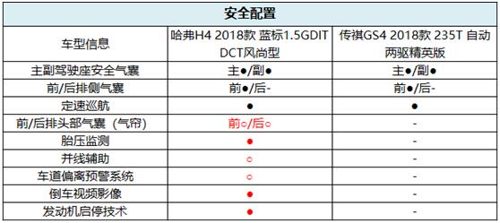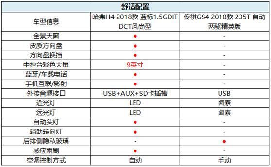 再对比两款车舒适性配置差异,哈弗H4的配置显然更有诚意,多配备了LED大灯、自动头灯、感应雨刷、自动空调等,再加上更显档次的全景天窗及更有科技感的全液晶仪表盘等,而传祺GS4仅比哈弗H4多配备了后排隐私玻璃,综合下来,哈弗H4的性价比优势相当明显。