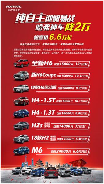除了产品更给力,哈弗H4在价格上也更有优势。近期哈弗的优惠活动吸引了广大用户的目光,2018年9月1日-10月31日,以“纯自主迎贸易战 哈弗神车降2万”为主题,包括全新哈弗H6、新哈弗H6 Coupe、哈弗H6运动版、哈弗H4、哈弗H2、H2s等在内的热销车型进行了全面优惠,降价幅度在1.4-2万元之间,哈弗M6更直接官降2.4万元。