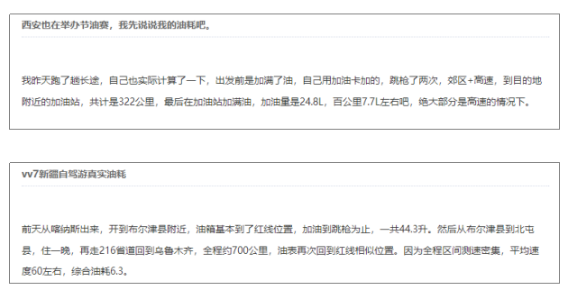 作为WEY品牌问世的首款车型,VV7一直被费油的舆论所困扰。出于好奇,小编我还专门跑到汽车之家论坛扒了扒,车主们果然很热情,分享了好多用车感受,好多VV7认证车主也分享了自己的油耗情况,然而,给出的答案却与网上高油耗的舆论截然相反。