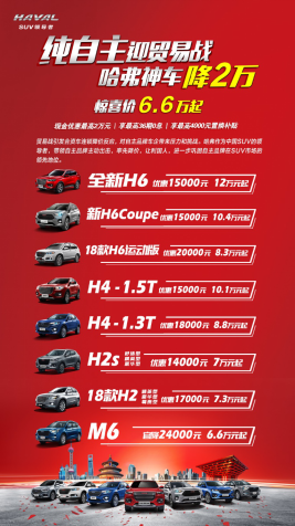 “远上寒山石径斜,白云生处有人家。停车坐爱枫林晚,霜叶红于二月花。”唐代诗人杜牧所描绘的这幅动人的山林秋色图,是很多人对十一黄金周出游的美好希冀。但若想心无旁骛享受自驾游的乐趣,一款可以轻松应对各种复杂路况的SUV必不可少,兼顾安全性与舒适性的哈弗SUV无疑是自驾游的最佳选择。 目前哈弗正在开展“纯自主迎贸易战,哈弗神车降两万”的优惠活动,9月1日到10月31日,哈弗旗下全部热销车型,包括全新H6、新H6 Coupe、H6运动版、H4、H2、H2s等,最高让利2万元,而M6车型更是直接官降2.4万元。恰逢十一黄金周,如此大幅度的降价优惠,正是自驾出行爱好者的购车良机。除了诚意满满的让利优惠,哈弗SUV更具备三个最适宜自驾游的购车理由,这三个理由将为你开启一段美妙的旅行经历。