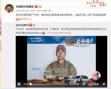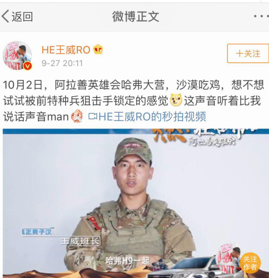 不仅如此,王威此番的行程简直可以用紧锣密鼓来形容。这边大营区刚拍完照,下午王威又全副武装赶到哈弗露营区的沙漠吃鸡现场,与哈弗车友展开了一场以3敌10的沙漠真实“吃鸡”较量。紧接着,哈弗大营的风骏7品鉴会、WEY·哈弗一起燃演唱会,王威也一一登场,畅谈感言。 据现场工作人员透露,在接下来的2天时间里,王威的还将参加哈弗大营举行的多个活动。这一系列动作让人不禁心生疑惑,哈弗品牌是不是会与新动作? 其实早在9月27日阿拉善英雄会开始前,王威就在自己的微博发布了一条有关哈弗H9的视频进行预热。要知道,刚刚于9月1号退役的王威,开通微博还不到一个月的时间,之前发布的内容多是与自己生活点滴相关。他发布的这条微博,粉丝评论一片支持点赞,现下更是来到哈弗大营现场支持。