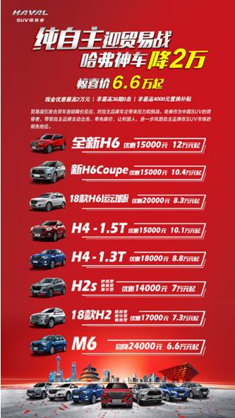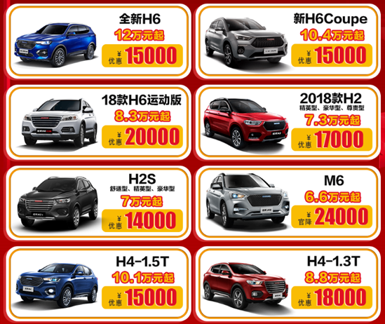 更多车型瞄准不同消费群体,细分市场各领** 不仅全新哈弗H6产品力突出,各细分市场的车型同样在各级别中展现了不俗的产品实力,例如今年新推出了一款强有力的“小鲜肉”——哈弗H4,从设计美学上就获得年轻人喜爱,满足了年轻购车群体彰显个性的需要。 哈弗H4的安全配置也是一大亮点,全方位六安全气囊、360环视系统,无缝拼接适时图像信息,盲点监测系统等都超越了同级别竞品的标准配置。再加上H4采用高强度高效能吸能一体式安全车身设计,通过了美国IIHS顶压试验的4.56倍压力考验。动力上同样很适合年轻消费者,提供1.3T和1.5T两种发动机以供不同需求的用户选择。 除了全新H6和H4之外,此次参加优惠让利的H6运动版、H2、H2s、M6等车型,也均在各自细分市场中保持了销量榜领衔的成绩,从外观、内饰、配置、安全、性能以及品牌价值方面均领先于同级别竞品车型。