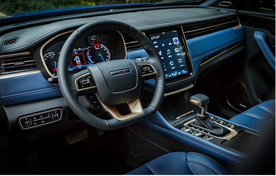 平底多功能方向盘较为粗犷,且加入真皮材质进行包裹;中控区域整体造型较为简洁,中间10寸显示屏格外醒目;