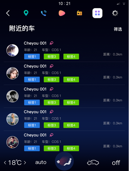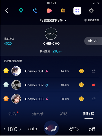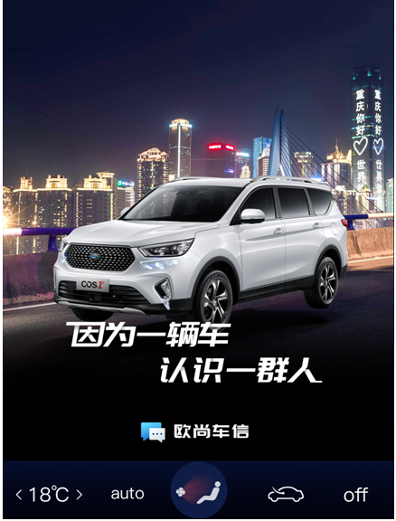 如果说COS1°外形赚足了路人的眼球,那它的车信功能则赚足了车里所有人的目光。 欧尚车信系统真正意义上实现了车载社交化、娱乐化、互联化。作为首款脱离移动终端的车载社交系统,可以实现实时位置共享、寻找附近的车友及群聊、语音消息、语音红包、地图红包、语音创建群聊、添加个人标签、实时排行打赏、快捷查找好友等社交功能,打造属于欧尚COS1°(科赛)社交圈层,是欧尚style生活服务平台的第一入口,通过一辆车,认识一群人。 欧尚车信系统具备发现、会话、排行榜、通讯录等四个板块的内容,用户可在此应用上与其他欧尚车主进行交流、分享。发现板块包括发现附近的车、附近的群等功能,同时也可以通过车牌号等信息精确搜索,待被搜索群主同意后即可进群,待被搜索车主同意后即可添加好友成功。 还可对用户驾驶行为评分、驾驶时长、驾驶里程等内容生成排行榜,用户可以对榜单上的车主进行打赏,可用支付宝扫码支付,打赏金额可提现。还可对自己的排行数据与好友进行分享,也可分享至车信群。如个人聊天时,可在会话模式下给好友发送语音消息,既可以选择点击屏幕上的点击说话按钮,也可以选择长按方向盘上的语音按键,按下说话,松开后自动发送。保障驾驶安全。 除基本的会话功能外,还可以发送名片、位置、红包等内容。在组队出行场景中,使用更便捷。同时欧尚Style 手机APP也将集成车信功能,两端信息互通。下车后仍可正常接收消息。