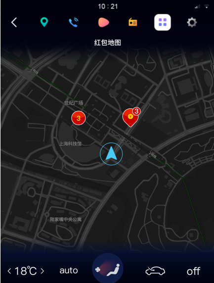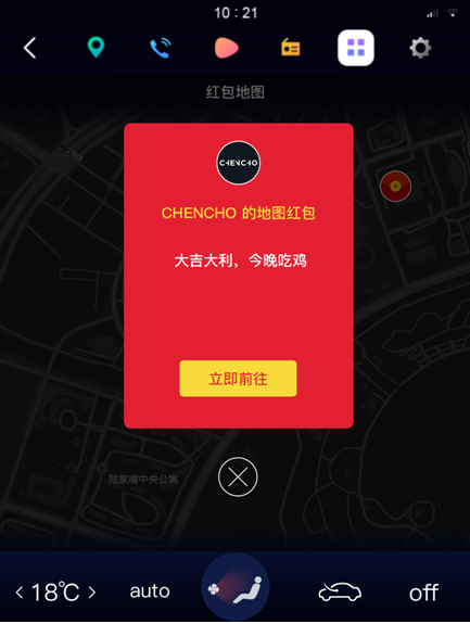 除普通红包外,车信还具备发送位置红包功能。如某4S店在所在地发出位置红包,车主驾车到店后即可点击领取,可以加强用户回店的概率。另外车主也可以点击红包地图,开车找红包,增强用车趣味性。