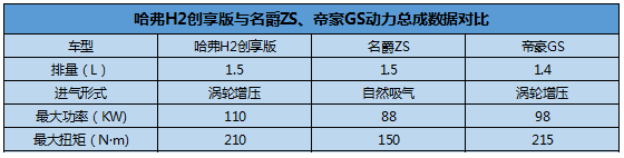 带”T”优势大,哈弗H2全面压制 动力方面,通过对比可以看出带“T“的优势还是非常明显的。虽然哈弗H2创享版和帝豪GS在数据上形成”你追我赶“之势,但在整体数据上、加速体感方面,哈弗H2创享版还是要领先不少。 在自动变速箱独领风 骚的今天,哈弗H2创享版搭载7DCT变速箱,正符合当下年轻人对轻松驾乘的诉求。帝豪GS 6DCT变速箱相较哈弗H2略低一个档次,而名爵ZS 4AT变速箱在价格相仿的情况下显得诚意不足。 另外,值得一说的是哈弗H2采用更为专业的前麦弗逊+后多连杆四轮独立悬架系统。与其余两款均采用前麦弗逊+后扭力梁式(名爵ZS为变截面扭力梁式)非独立悬架相比,在行车舒适、操控性等方面都有着质的提升,哈弗H2创享版更符合真SUV属性。 配置一览无余,哈弗H2更具品价比 “内外兼修“中,内不仅是看得见摸得着的内饰,更是被大家容易忽略的安全配置。首先值得肯定的是三款车型在安全配置方面都比较丰富,以这个价位来说都是合理且有诚意的。主/副驾安全气囊、胎压监测、车身稳定系统、刹车辅助系统、牵引力控制新系统,三款车型均有配备,而这次对比中售价最低的哈弗H2创享版双离合风尚型,竟比另外两款车型多了发动机启停和陡坡缓降,这样的性价比确实令人惊喜。 另外,在其他安全配置方面,哈弗H2创享版除了车身使用超65%高强度钢材之外,严把质量关,C-NCAP、A-NCAP双五星安全评级、环状包络骨架,高强度乘员舱等安全设计,不仅提高了车辆安全性能,同时也展现其工艺水准处于国内领先水平。 综上所述,通过对三款车型外观内饰、动力总成、主要配置的深度解析,可以得出哈弗H2创享版最具“内外兼修”的品质。而放眼整个小型SUV市场来看,其标杆车型的地位依然不可撼动。结合终端最低低于7万元的入手价格也让其在同级中有着“逆天”的品价比。