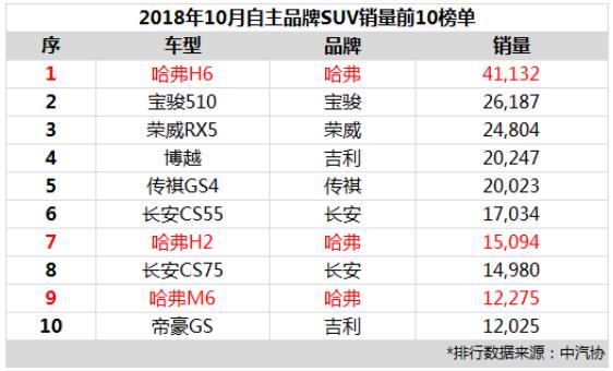 哈弗H6、H2、M6霸榜,自主SUV前十独占三席