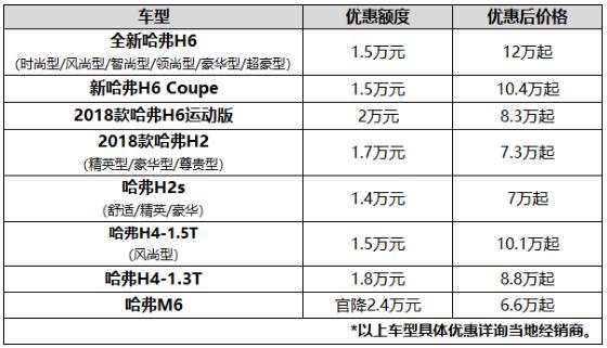 哈弗的这波优惠幅度空前。其中,哈弗M6官降2.4万元,仅售6.6万元起,成为一线品牌中唯一一款价位下探至7万级的紧凑级SUV。哈弗H6运动版优惠2万元,仅售8.3万元起。也就是说,只需要8.3万元,用户就能买到中国最畅销的这款SUV。此外,全新哈弗H6、新哈弗H6 Coupe、哈弗H4、哈弗H2,分别优惠1.4-1.8万元不等,可谓全面优惠、真情可鉴。