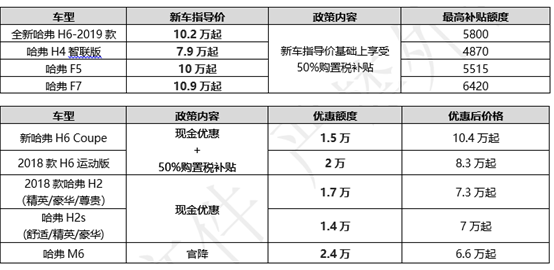 具体来说,此次上市的全新哈弗H6冠军版及哈弗H4智联版一经推出,就能在新车指导价的基础上享受高达50%的购置税补贴;而不久前推出的广受欢迎的哈弗F5及哈弗F7也同样参与此次购置税减半活动,最高补贴超过6千元。新车上市之初即如此大幅让利,哈弗可谓诚意十足,再次刷新了SUV价值新标杆。除此之外,哈弗热销车型新哈弗H6 Coupe2018H6运动版均在购置税减半优惠基础上,另享有现金优惠,优惠额度高达1.5-2万元;2018款哈弗H2H2s则享受1.4-1.7万元不等的现金优惠,哈弗M6更是直接官降达2.4万元,仅售6.6万起。