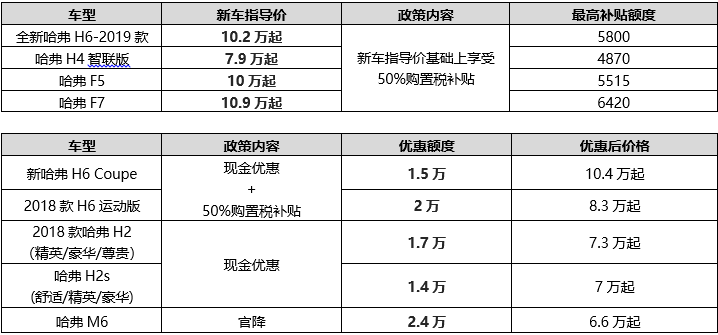 外界的认可助推哈弗H6登顶销冠,这也让哈弗想通过真金白银的优惠让利回馈大家的认可。哈弗推出购置税减半优惠,活动期间,最新上市的全新哈弗H6冠军版能享受高达50%的购置税补贴;新哈弗H6 Coupe2018H6运动版在购置税减半优惠基础上,另享现金优惠,优惠额度高达1.5-2万元。对消费者来说,仅需8.3万起就能享有一台集“美貌与实力”于一身的神车。