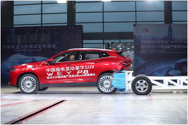 此次试验完全按照全球最严苛的美国联邦机动车法规FMVSS301和FMVSS305的要求实施,重1361KG的台车以80km/h的时速撞向WEY P8的车尾,撞击重叠率为70%,可以覆盖高速道路各种实际碰撞情况,复现典型高速公路事故尾碰。试验结果显示,WEY P8在燃油系统完整性、电安全要求以及总体结果均获得PASS(通过)级别,成为中国首款成功挑战美规尾碰的车型。