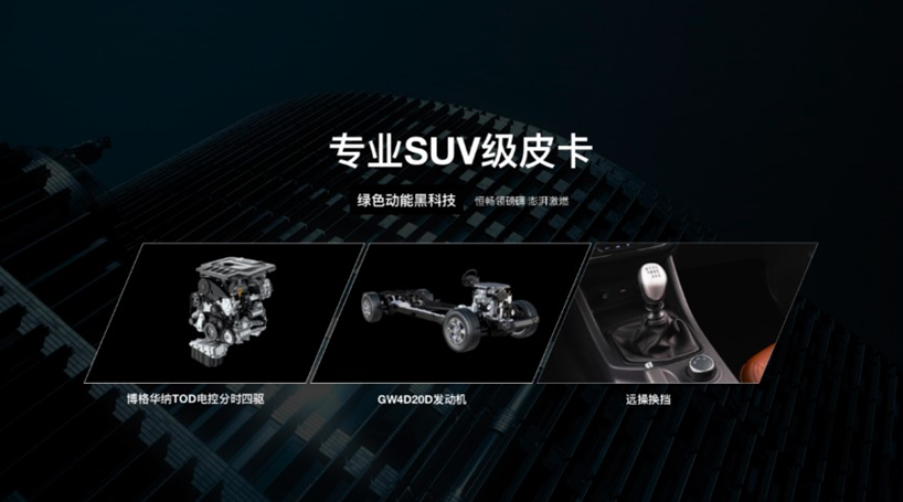 先来聊聊皮卡最重要的底盘系统,前双叉臂后钢板悬的非承载车身保证了极为强大的运载能力,长城为了保证一定的舒适性,前悬使用更加复杂而且减震能力更好的前双叉臂,为了保证后悬的“吃劲儿”能力,传统的钢板悬能保证货舱拉着几吨货物不塌屁股。