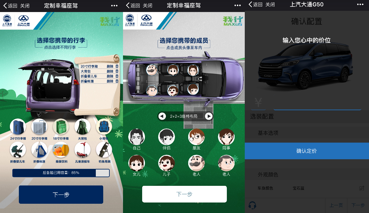 通过对海量用户数据的收集和分析,上汽大通了解到用户呼声最高、选配最多的配置。基于此,上汽大通在广州车展推出了G50首发款。该车匹配了用户选择最集中的配置,包括LED大灯、全景天窗、360°全景影像、上汽阿里斑马智能互联系统、前气囊、侧气囊、侧气帘三重保护、二三排ISOFIX儿童座椅接口、高档隐私玻璃等,使用户在上汽大通G50全系正式上市之前,就能够尝鲜购买。