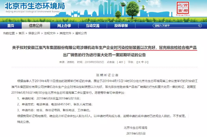 北京市生态环境局在5月5日发布公告,江淮汽车涉嫌对机动车污染控制装置以次充好,冒充排放检验合格产品出厂销售,将对该行为进行重大处罚,拟对案件举行听证。 由于江淮汽车提出听证延期申请,最终该案件的听证延期到5月16日举行。 由于听证会尚未举行,暂未清楚具体“造假”情况,最终还要看处罚决定书。有江淮汽车内部人士向媒体透露,江淮这次被指排放造假的车型主要是商用车,在排放标准升级过程中,有一些卡车的排放能力没有跟得上。 但目前为止,涉及造假的江淮车型及规模尚不清楚。 根据江淮汽车发布数据,2018年汽车销量为46.24万辆,同比下滑9.48%。今年1-4月江淮汽车销量为16.4万辆,同比下滑13%。 业绩报告显示,江淮汽车2018年营业收入达501.61亿元,同比增长1.95%;但归属于上市公司股东的净利润为亏损7.86亿元,同比下降282%。 对于江淮汽车排放造假问题,我们将继续保持关注。 |