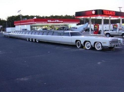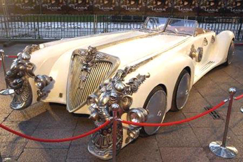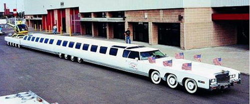 美国加利福尼亚州伯班克市杰·奥尔伯格设计出的一辆高级轿车,这是世界上最长的汽车,长度为30.5米,下面有26个车轮,看起来就像一列小火车。车里面的设备很多,其中包括带跳板的游泳池、豪华的套房、特大的水垫床。