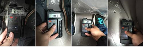 上图为车辆匀速在60km/h时,主驾驶、副驾驶、主驾驶后排、副驾驶后排的辐射值分别为15.34μT、3.16μT、15.88μT、10.90μT。对比40km/h的数值可以发现,在副驾驶的位置辐射是最小的,笔者认为这与电池组的布置存在一定关系。